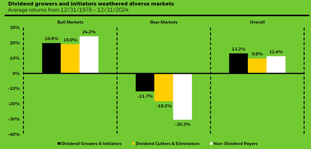 Dividend growth stocks have historically provided lower volatility and better downside protection through market cycles, thanks to consistent payouts and financial strength. As shown in the chart below, while these stocks may lag non-dividend payers during bull markets, they have historically declined less in bear markets and delivered the highest overall returns from 1978 to 2024. This long-term outperformance is notable, given that non-dividend payers are typically seen as more growth oriented.